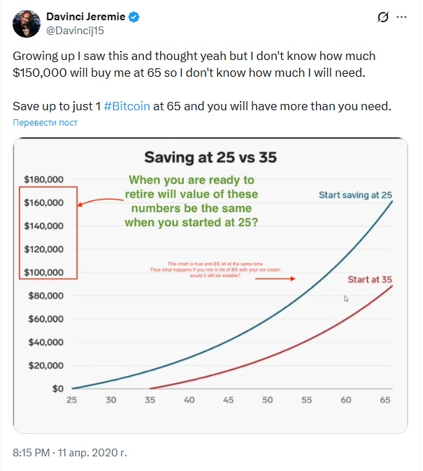 Взрослея, я размышлял, сколько мне понадобится для выхода на пенсию в 65 лет, но так и не определился. Накопите 1 биткоин к 65, этого будет более чем предостаточно, — написал в Твиттере аналитик Davincij15.