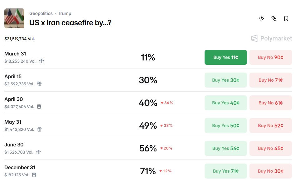 На этом фоне децентрализованная платформа прогнозирования Polymarket превратилась в своего рода табло для геополитических спекуляций в режиме реального времени. С конца февраля трейдеры вложили десятки миллионов в контракты, привязанные к срокам потенциального прекращения огня.
