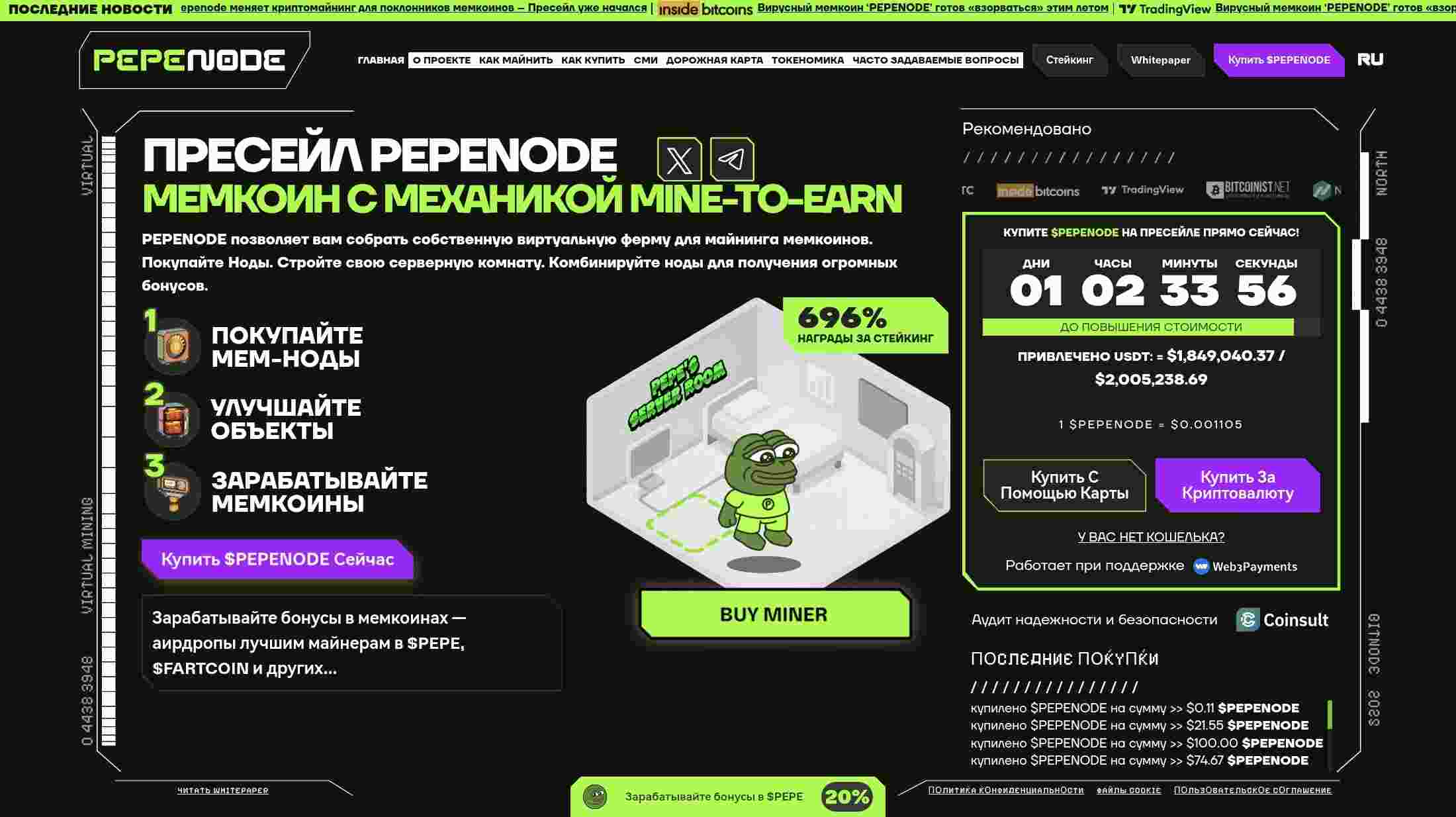 На момент публикации стоимость $PEPENODE составляет $0,001105, а объём сборов на пресейле превышает $1,84 млн из целевых $2 млн. Для участников предпродажи доступен стейкинг, который активируется после TGE. Листинг запланирован на конец 2025 — начало 2026 года.