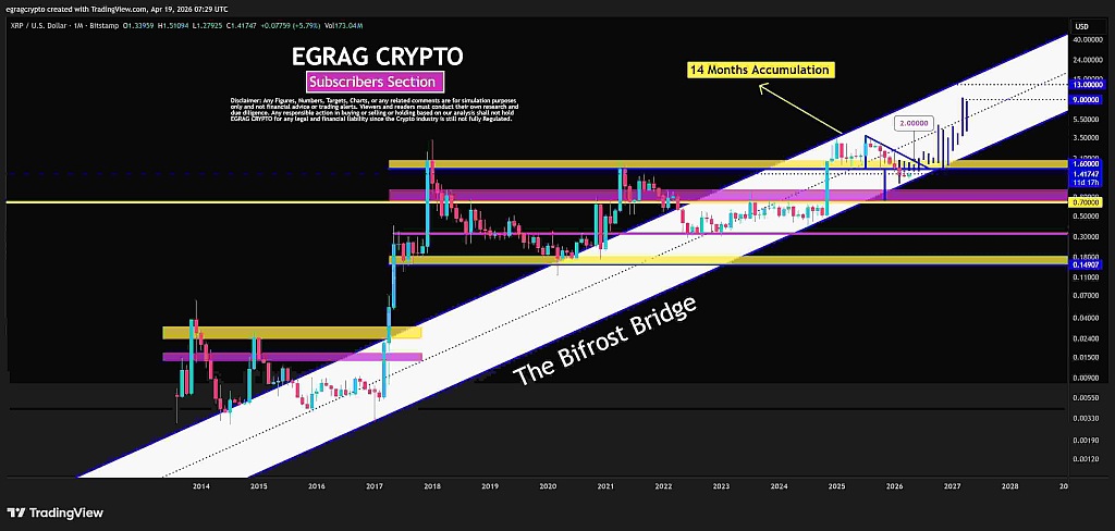 По данным эксперта по торговле Egrag Crypto, цена XRP консолидировалась более года после прорыва многолетнего диапазона сопротивления между $0,70 и $1,60. Таким образом, цена XRP может положить начало новому параболическому ралли к новому историческому максимуму (ATH) в ближайшие месяцы, если она будет стабильно закрываться выше $2,00.