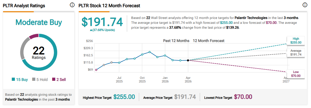 Парам Сингх не единственный аналитик Уолл-стрит, кто положительно оценивает акции PLTR. В целом акции Palantir оцениваются как «Умеренная рекомендация к покупке» и, согласно данным, полученным Happy Coin News от аналитической платформы TipRanks 30 апреля, в среднем ожидается их рост на 38,83% до $191,74 в течение следующих 52 недель.