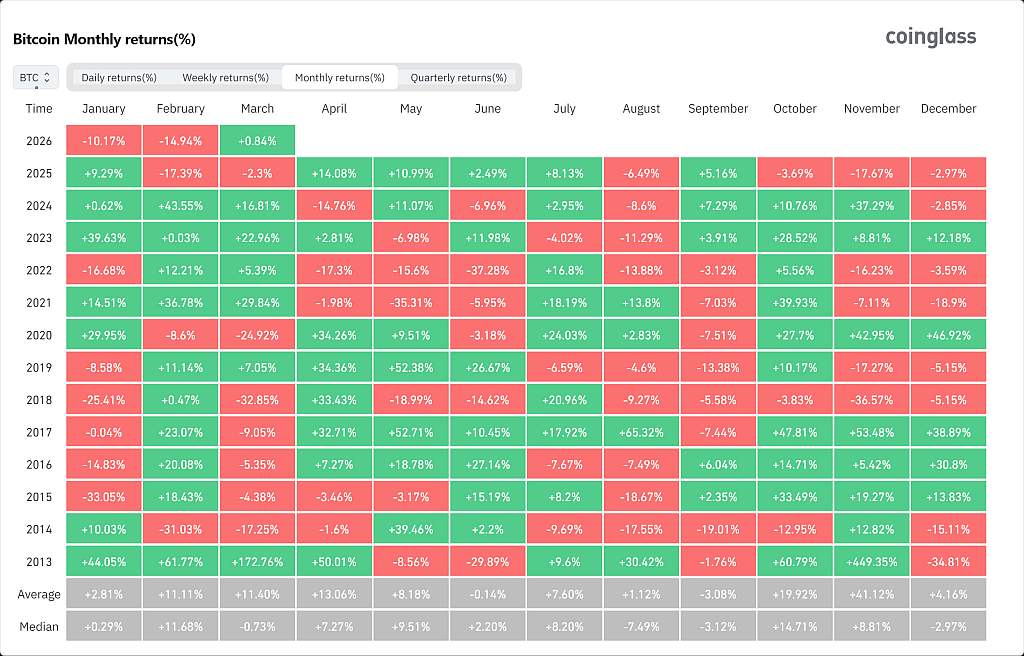 В 2025-2026 годах BTC упал на 4% в октябре, на 18% — в ноябре и на 3% — в декабре, затем последовало падение на 10% в январе, на 15% — в феврале, а в марте месячный прирост составил 3,3% (данные CoinGecko).