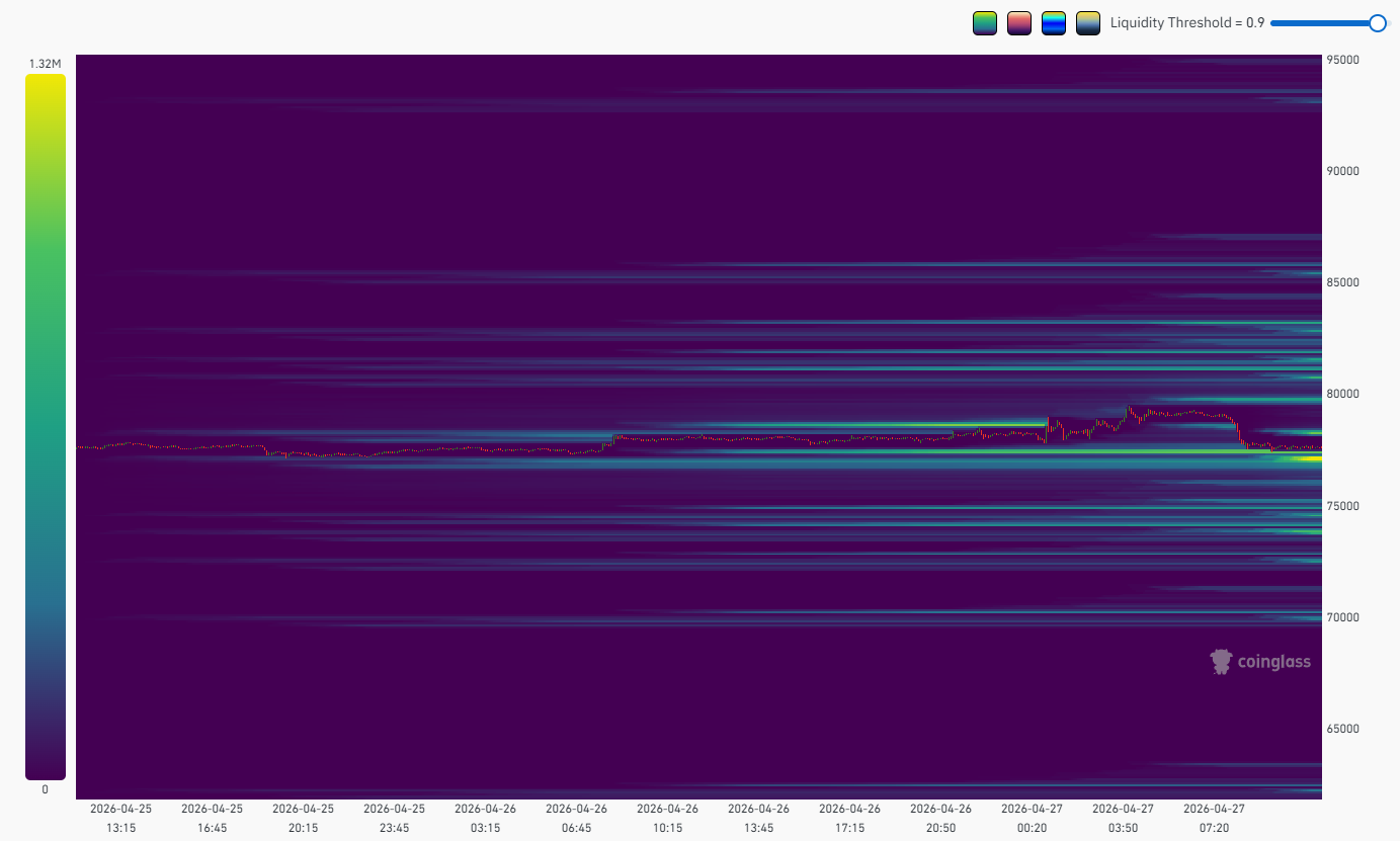 Данные CoinGlass показывают высокую ликвидность на продажу, сосредоточенную между уровнями $78,000 и $80,000 в двух отдельных кластерах.