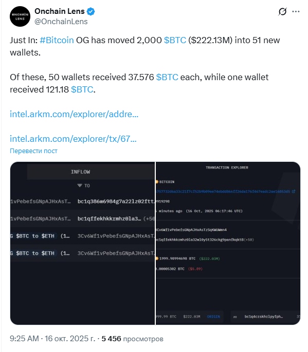 По данным Onchain Lens, на 50 кошельков-получателей поступило примерно по 37,5 BTC каждый, а один — 121 BTC. Транзакции были зафиксированы на блоке номер 919298, а общие сетевые комиссии не превысили $6.