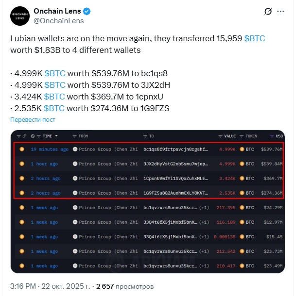 Сегодня кошельки, связанные с китайским майнинговым пулом LuBian, переместили 15,959 BTC на сумму около $1,83 млрд на четыре разных адреса. Это второй крупный перевод почти за две недели.