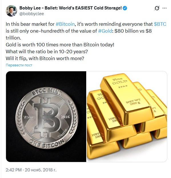 Бобби Ли напоминает, что BTC по-прежнему стоит в сотни раз меньше золота, однако в течение десяти или двадцати лет это соотношение будет меняться, и, вероятно, BTC повысит свою ценность.