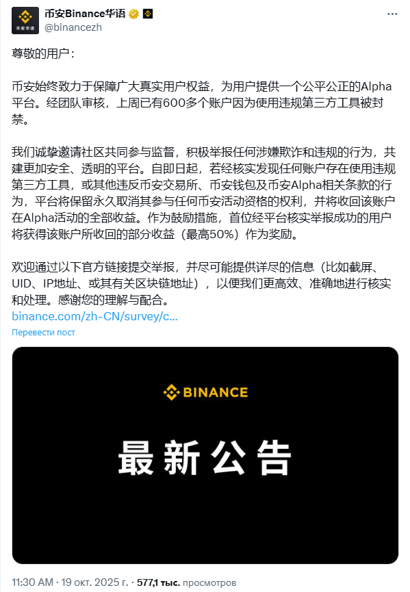 В китайском аккаунте биржи Binance появилась информация о блокировке более 600 аккаунтов пользователей за использование «неавторизованных сторонних инструментов».