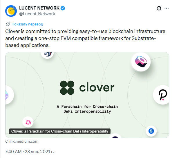 Платформа Clover стремится предоставить простую в использовании блокчейн-инфраструктуру и создать универсальную платформу, совместимую с EVM (Виртуальной машиной Ethereum), для приложений на основе Substrate, инфраструктуры, позволяющей создавать блокчейны.