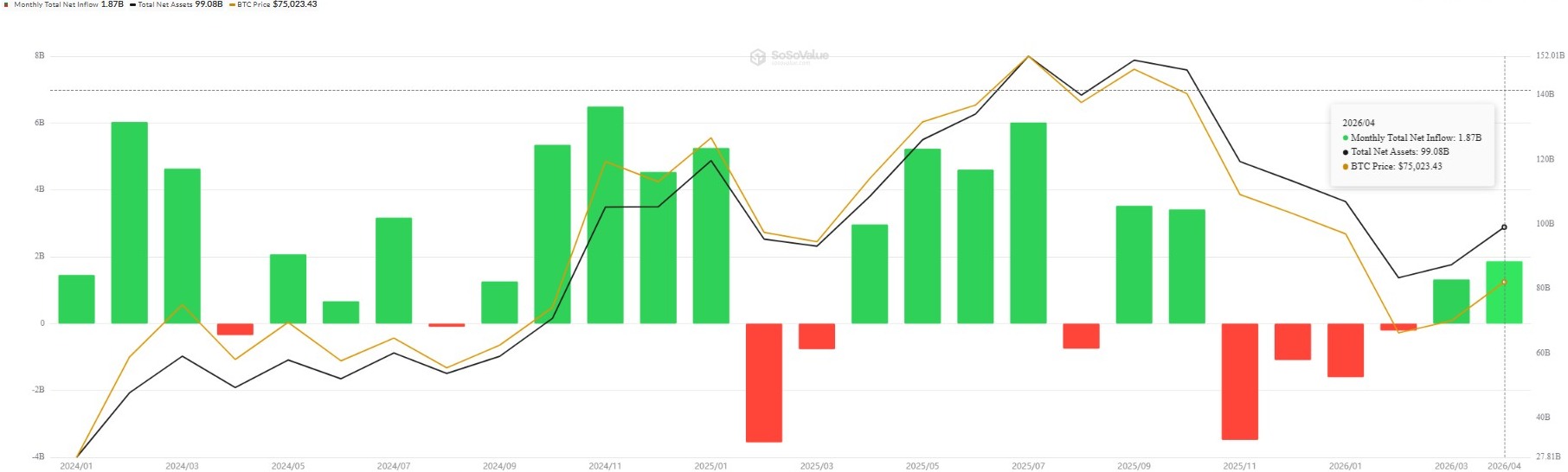 Кроме того, отмечается усиление институционального участия. Приток средств в ETF на BTC достиг $1,32 млрд в марте и 1,87 млрд в апреле после четырёх месяцев оттока. Поступление капитала говорит о возросшем институциональном интересе, несмотря на недавние колебания цен. В то же время данные о ликвидации показали большее давление на медвежьи позиции, чем на бычьи.
