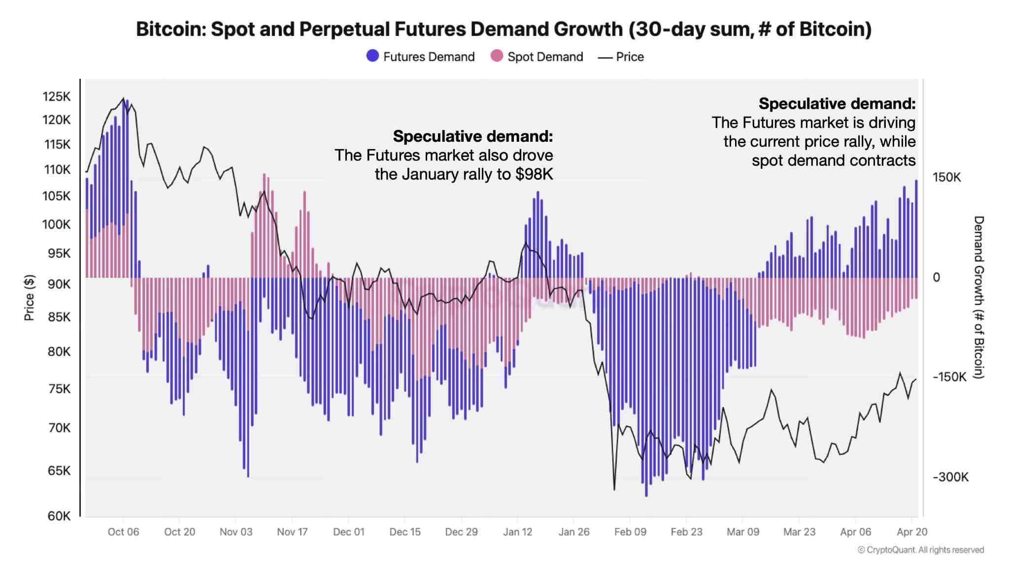 Морено отметил, что аналогичная ситуация сложилась в январе, когда активная торговля бессрочными фьючерсами помогла подтолкнуть биткоин к отметке $98,000. Этот рост быстро потерял импульс из-за слабого спотового накопления.