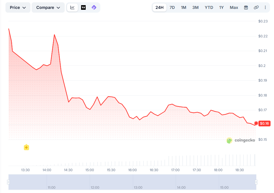 Торги начались с исторического максимума в $0,38, показывают данные CoinGecko, а после падения примерно на 55% его цена скорректировалась до уровня $0,17.