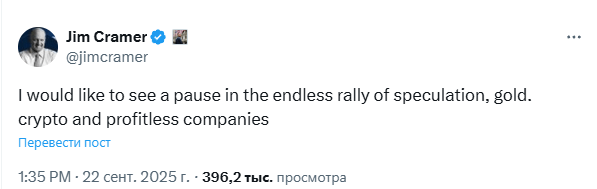 Джим Крамер написал в соцсети о «бесконечном ралли спекуляций» вокруг золота, криптовалют и компаний, операционная деятельность которых заканчивается убытками.