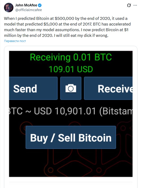 Мало кто серьезно воспринял это эпатажное высказывание, однако теперь, когда биткоин перешел за $11000, люди призадумались. Тем временем Макафи только поднимает ставки.