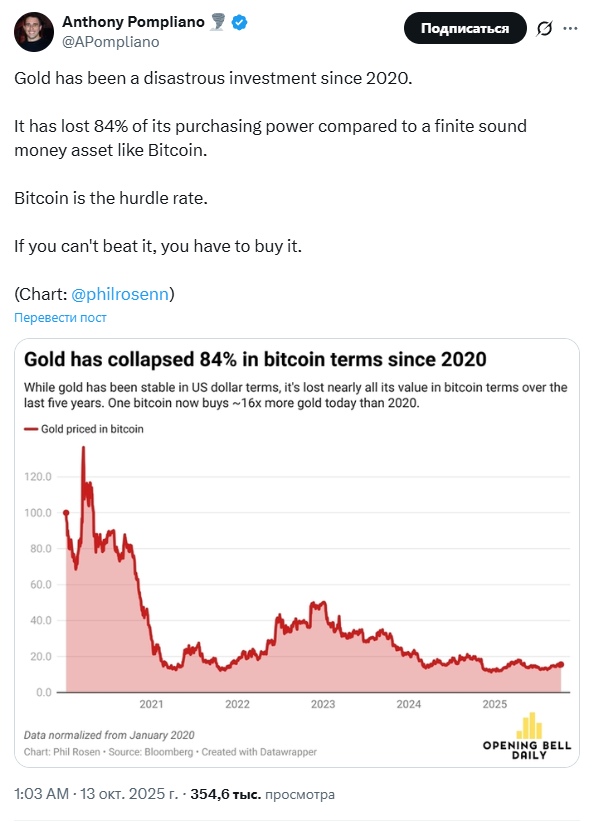 Золото потеряло 84% своей покупательной способности по сравнению с таким надёжным активом, как биткоин. Если вы не можете найти ничего лучше, вам придётся его покупать, — написал Помплиано.