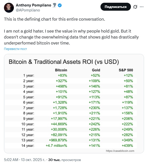 Помплиано ответил критикам словами о том, что биткоин превзошёл золото на любом временном интервале, при этом он не является ненавистником золота.