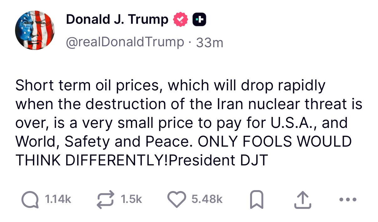 В воскресенье президент США Дональд Трамп заявил, что краткосрочный скачок цен на нефть — это «очень небольшая величина», а цены стабилизируются, как только «устранится иранская ядерная угроза».