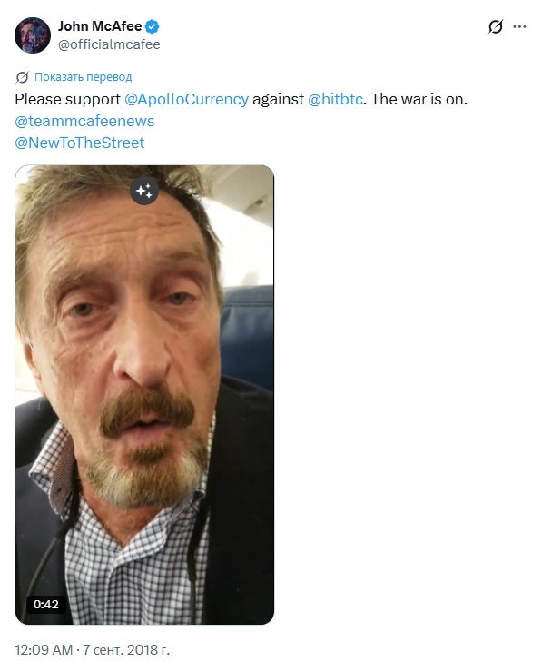 Джон Макафи является известным недоброжелателем HitBTC, и теперь он выступил в поддержку валюты Apollo, которая недавно отклонила предложение HitBTC о листинге на биржу. Отказ связан с печально известной репутацией HitBTC, не раз за обвиненной в мошенничестве и стоимостью листинга в $400 000.