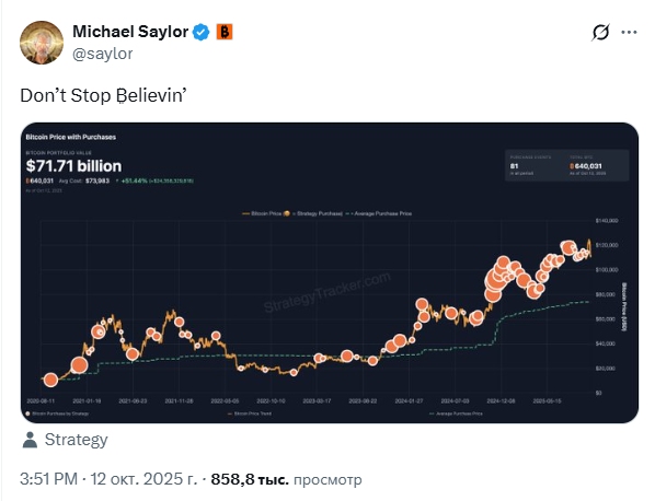 К своему сообщению он прикрепил скриншот с тремя словами «Не переставайте ₿elievin [верить]». Сам Сэйлор просто не может себе позволить потерять веру, поскольку Strategy хранит 640,031 BTC, оцениваемые примерно в $71,71 млрд при средней цене $73,983 за монету. Эти цифры дают нереализованную прибыль Saylor & Co., близкую к 51,44% или $24,35 млрд.