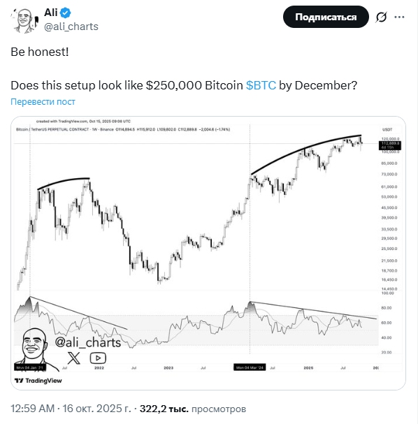 Тем не менее у аналитиков нет единого мнения по поводу реалистичности таких прогнозов. Например, Али Мартинес опубликовал недельный график, демонстрирующий медвежью дивергенцию. На нём цена достигла новых максимумов, но индекс относительной силы (RSI) не последовал за ней. В прошлых циклах эта модель приводила к серьёзным откатам.
