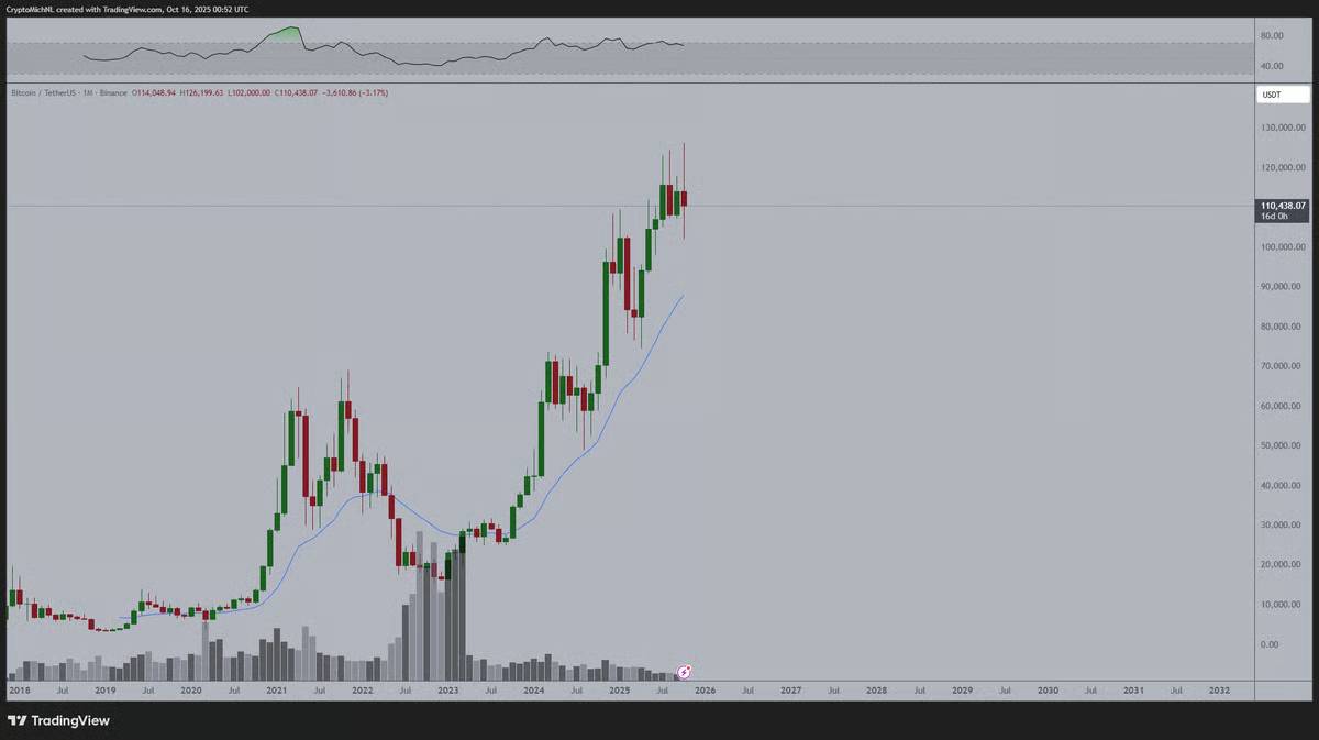 Михаэль ван де Поппе высказал иную точку зрения на основе месячного графика. По его мнению, цена остаётся в восходящем тренде и держится выше месячной скользящей средней.