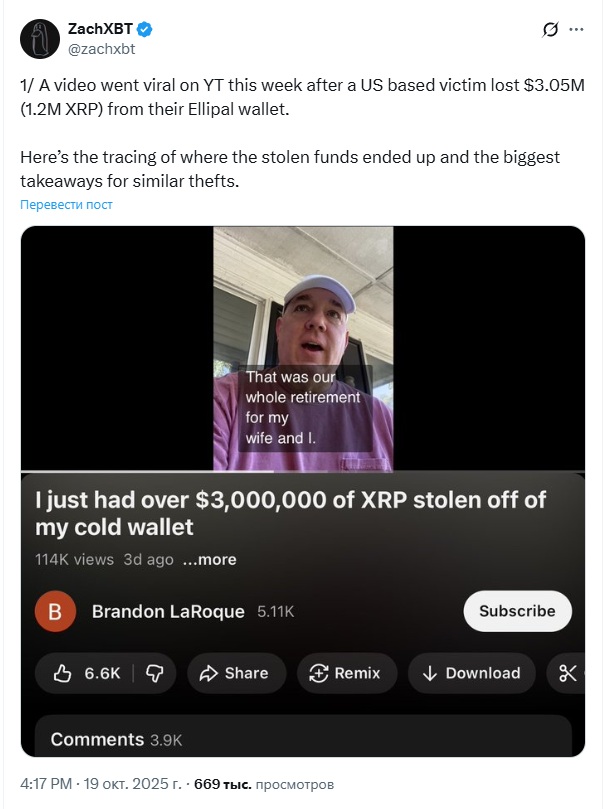 Блокчейн-детектив ZachXBT обнаружил, что после взлома кошелька Ellipal американский пользователь потерял криптовалюты на сумму $3,05 млн в XRP. Токены были переведены через несколько кошельков и в конечном итоге отмыты на внебиржевых площадках.