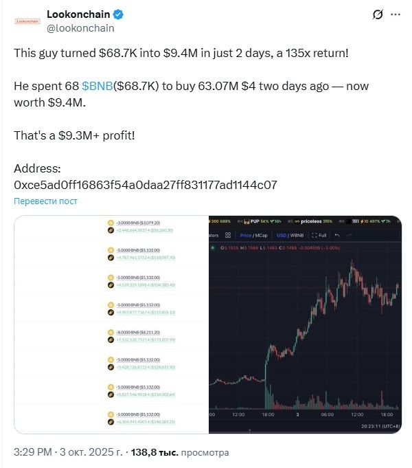 Другой криптотрейдер всего за 48 часов превратил инвестиции в размере $68,700 примерно в $9,4 млн. Сделка, инициированная 30 сентября, принесла ему по состоянию на 2 октября 135-кратный прирост.