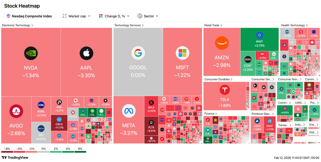 В результате акции энергетического и промышленного секторов показали относительную силу, в то время как некоторые сегменты программного обеспечения и полупроводников испытывали трудности на фоне опасений по поводу разрушительного воздействия искусственного интеллекта (ИИ) и завышенной стоимости.