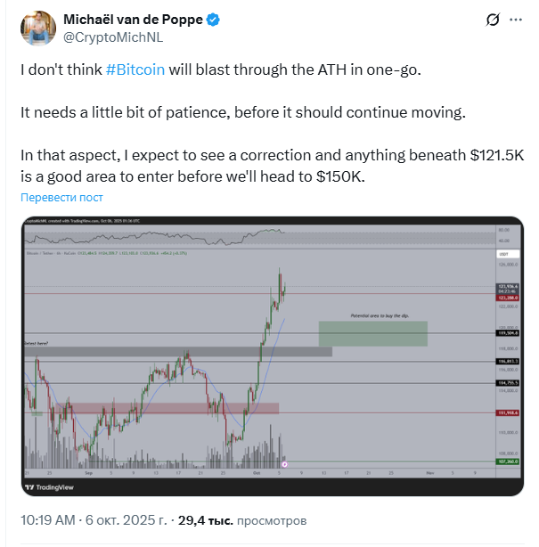 Я не думаю, что биткоин одним махом преодолеет исторический максимум, — написал ван де Поппе. — Любая цена ниже 121,5 тыс. долларов — хорошая зона для входа, прежде чем мы достигнем отметки в 150 тыс. долларов.