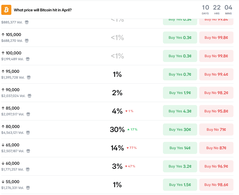 Падение в апреле до $65,000 оценивается в 13% при объёме торгов в $2,4 млн. Падение до $60,000 имеет 3%-ную вероятность и объём торгов в $1,7 млн. Рынок не прогнозирует обвал, но и не игнорирует риск.