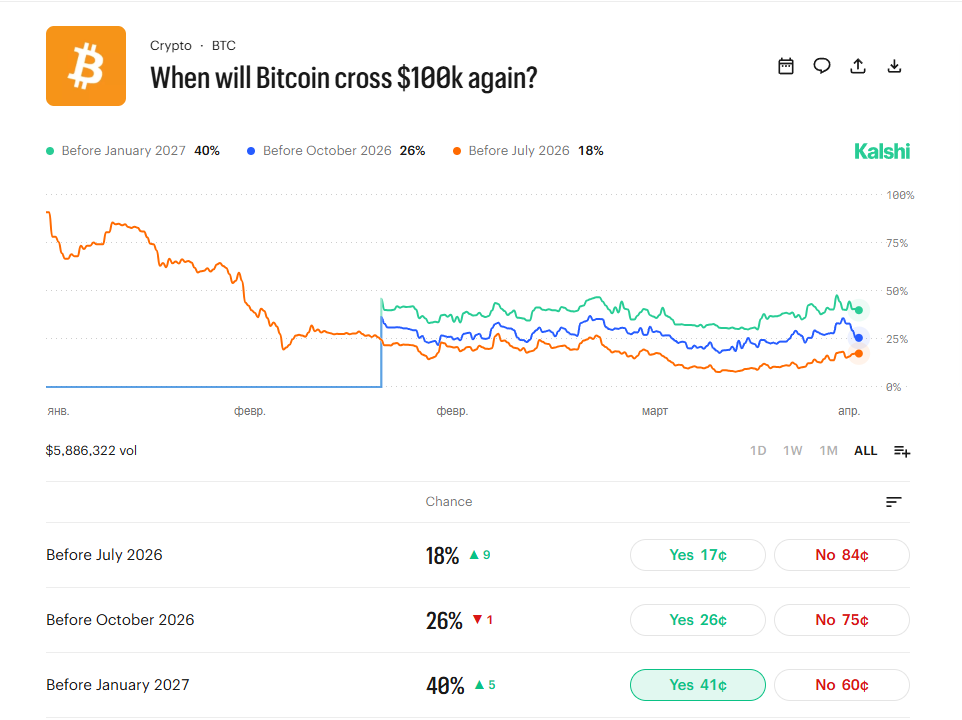 Рынок Kalshi на цену $100,000 более перспективный. Трейдеры оценивают вероятность преодоления биткоином этого уровня до июля 2026 года в 18%. Вероятность возрастает до 26% до октября и до 40% до конца года. Общий объём торгов в этой серии составляет $5,9 млн. Рынок открылся в феврале и рассчитывается с использованием усечённого среднего значения по BRTI, исключая выбросы из 1-минутного окна.