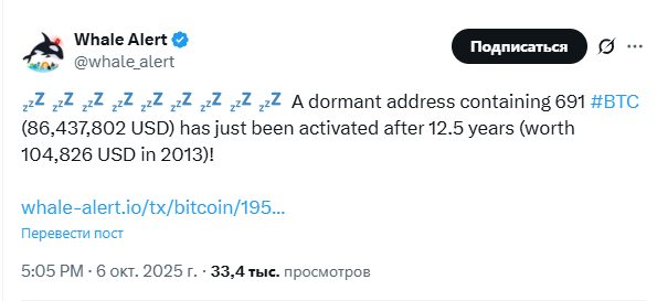 За сутки цена биткоина (BTC) взлетела до нового рекорда в $125,337, и это ралли, как это случалось раньше, пробудило неактивного биткоин-кита, на кошельке которого хранилось 691 BTC.