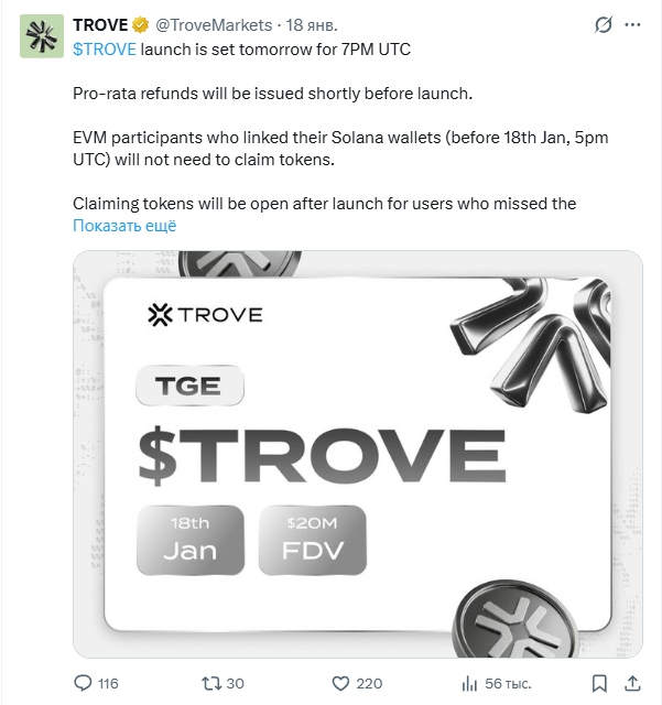 Ранее заявлялось, что токен $TROVE и биржа бессрочных токенов будет запущена на платформе Hyperliquid. Теперь же команда решила выбрать блокчейн Solana.