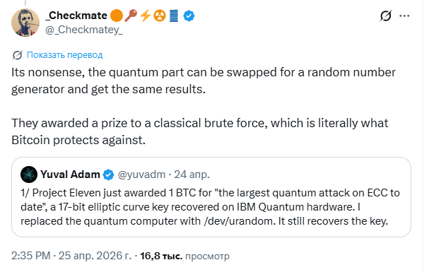 Это полная чушь, квантовую составляющую можно заменить генератором случайных чисел и получить точно такие же результаты, — опроверг это утверждение ончейн-аналитик Checkmate.