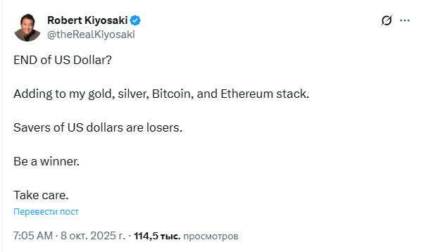 Роберт Кийосаки вновь забил тревогу по поводу плачевного состояния американской фиатной валюты в очередном своём посте: