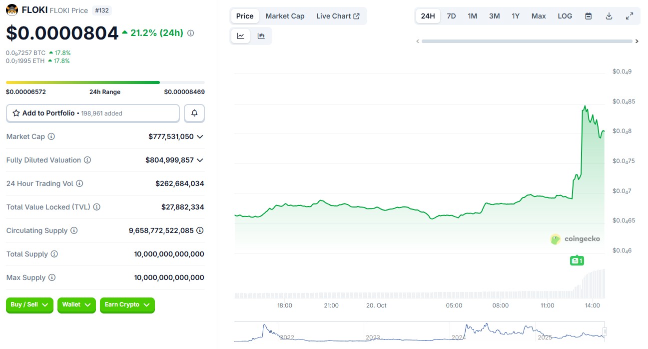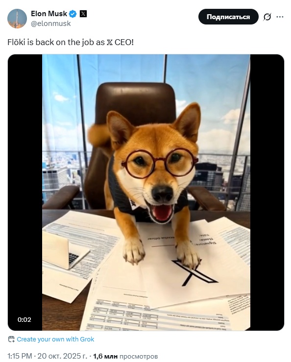 Сегодня стоимость мемкоина FLOKI резко выросла после того, как генеральный директор Tesla Илон Маск опубликовал созданное искусственным интеллектом видео со своей собакой породы сиба-ину.