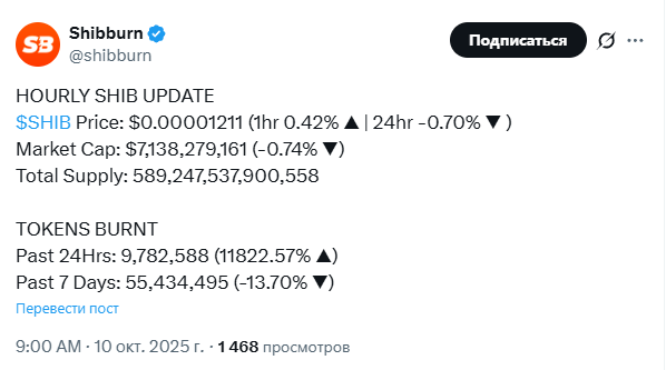 По данным трекингового сервиса Shibburn, за сутки было сожжено в общей сложности 9,782,588 SHIB, что привело к увеличению суточного количества сжигаемых токенов на 11,822%.