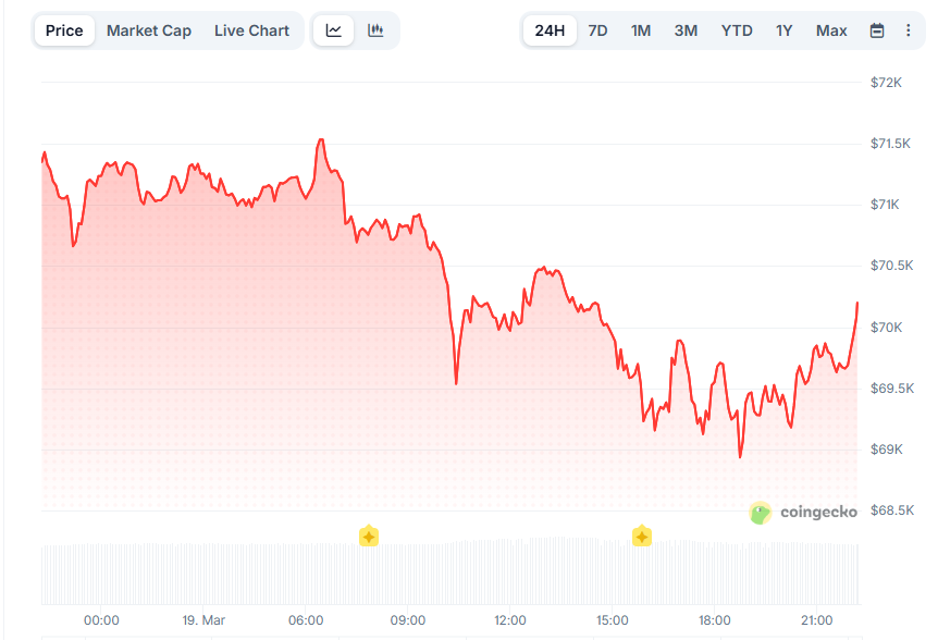 Ночью 19 марта цена биткоина поднялась выше отметки $70,000 до $70,555, сократив дневные потери на 1% (данные CoinGecko).