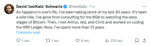 В своём посте Дэвид Шварц выразил признательность компании и сообществу, добавив, что для него время работы в Ripple было «одной из величайших почестей в жизни».