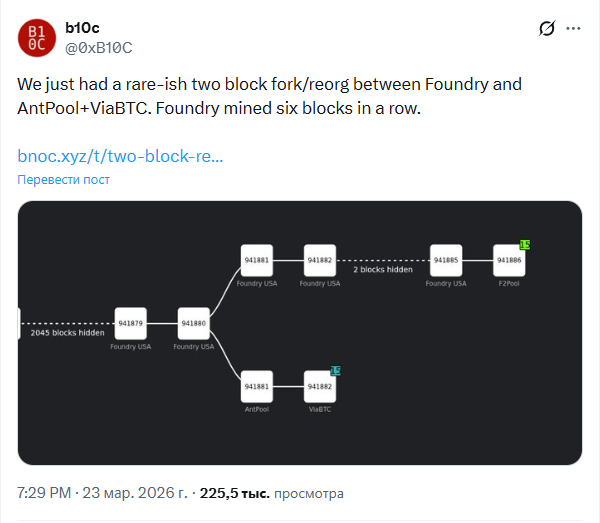 Блоки, добытые пулами AntPool и ViaBTC, были отброшены, превратившись в так называемые «устаревшие» (stale) или «осиротевшие» (orphaned) блоки. В общей сложности Foundry USA удалось добыть семь блоков подряд (с 941,879 по 941,885).