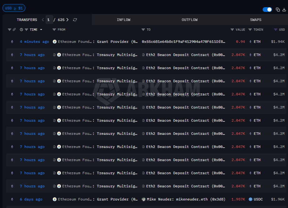 По данным Arkham Intelligence, в понедельник 30 марта из казначейского кошелька фонда были отправлены 22,517 ETH на адрес, обозначенный как контракт депозита ETH2 Beacon. Кошелёк получателя представляет собой смарт-контракт на Ethereum, который размещает ETH на стейкинге Beacon Chain.