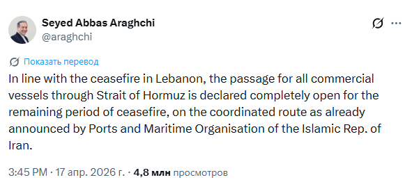 В соответствии с прекращением огня в Ливане, проход для всех коммерческих судов через Ормузский пролив объявляется полностью открытым на оставшийся период прекращения огня, — написал в соцсетях министр иностранных дел Сейед Аббас Арагчи.