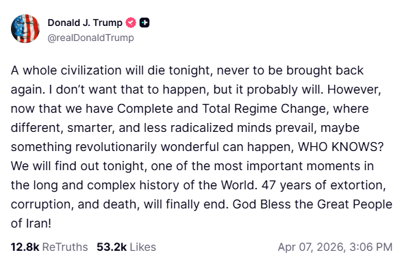 Сегодня ночью погибнет целая цивилизация, которую уже никогда не удастся возродить, — предупредил Трамп.