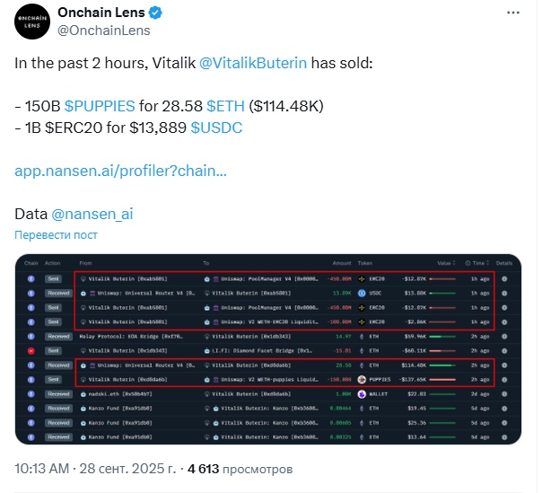 Виталик Бутерин снова привлёк к себе внимание с помощью операций с монетами на основе мемов: 28 сентября 2025 года он продал 150 млрд токенов PUPPIES за 28,58 ETH, что примерно равно $114,000.