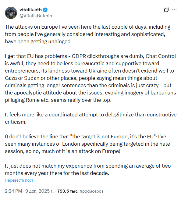 Бутерин добавил, что волна негатива игнорирует неоднородность Европы. Он указал на региональные правовые рамки, социальные системы и политические приоритеты, которые различаются в зависимости от страны.