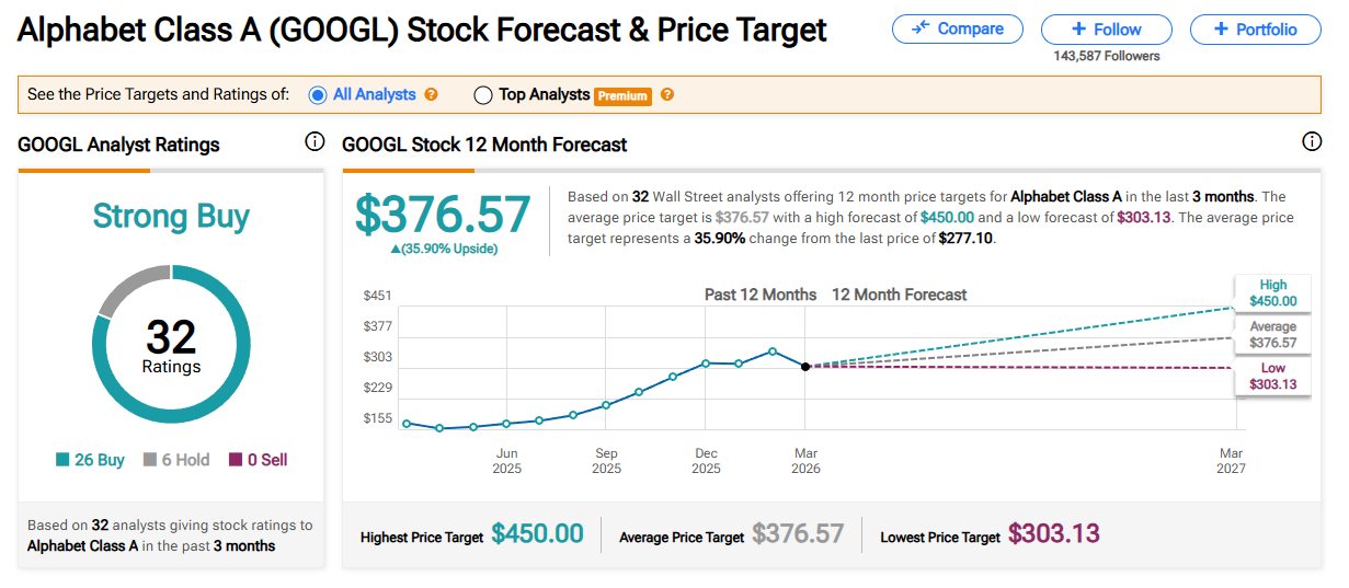 На Уолл-стрит считают акции Google «рекомендуемой покупкой» с прогнозом по росту на 35,97% в течение следующих двенадцати месяцев до $376,57. Это усреднённый показатель, рассчитанный Tip Ranks.